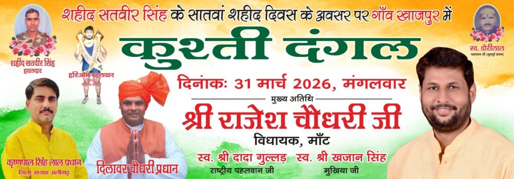 मथुरा/नौहझील: क्षेत्र के गांव खाजपुर में शहीद सतवीर सिंह के बलिदान दिवस के अवसर पर 31 मार्च 2026 को भव्य कुश्ती दंगल का आयोजन किया जाएगा। हर वर्ष की तरह इस बार भी आयोजन को लेकर ग्रामीणों में खासा उत्साह देखने को मिल रहा है और तैयारियां अंतिम चरण में हैं।