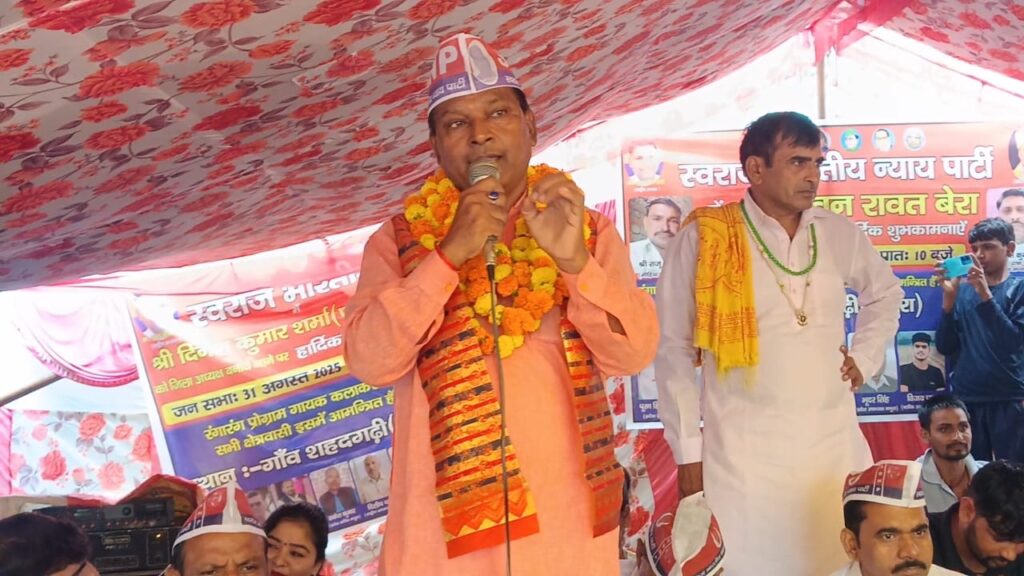 मथुरा। शहदगढ़ी गांव में स्वराज भारतीय न्याय पार्टी द्वारा विशाल जनसभा का आयोजन किया गया। कार्यक्रम में मुख्य अतिथि के रूप में पार्टी के राष्ट्रीय अध्यक्ष मा. इंद्रजीत सिंह पहुंचे।